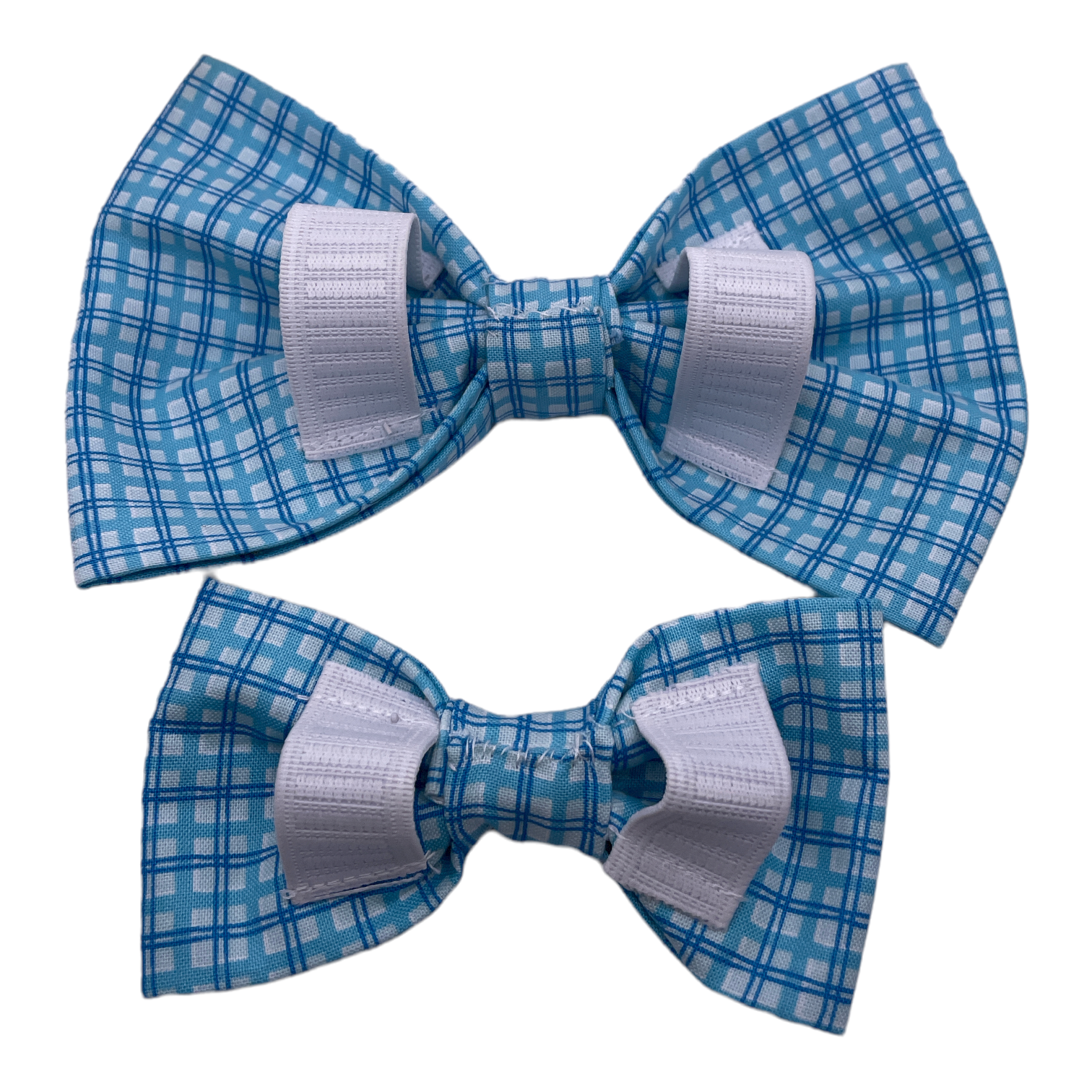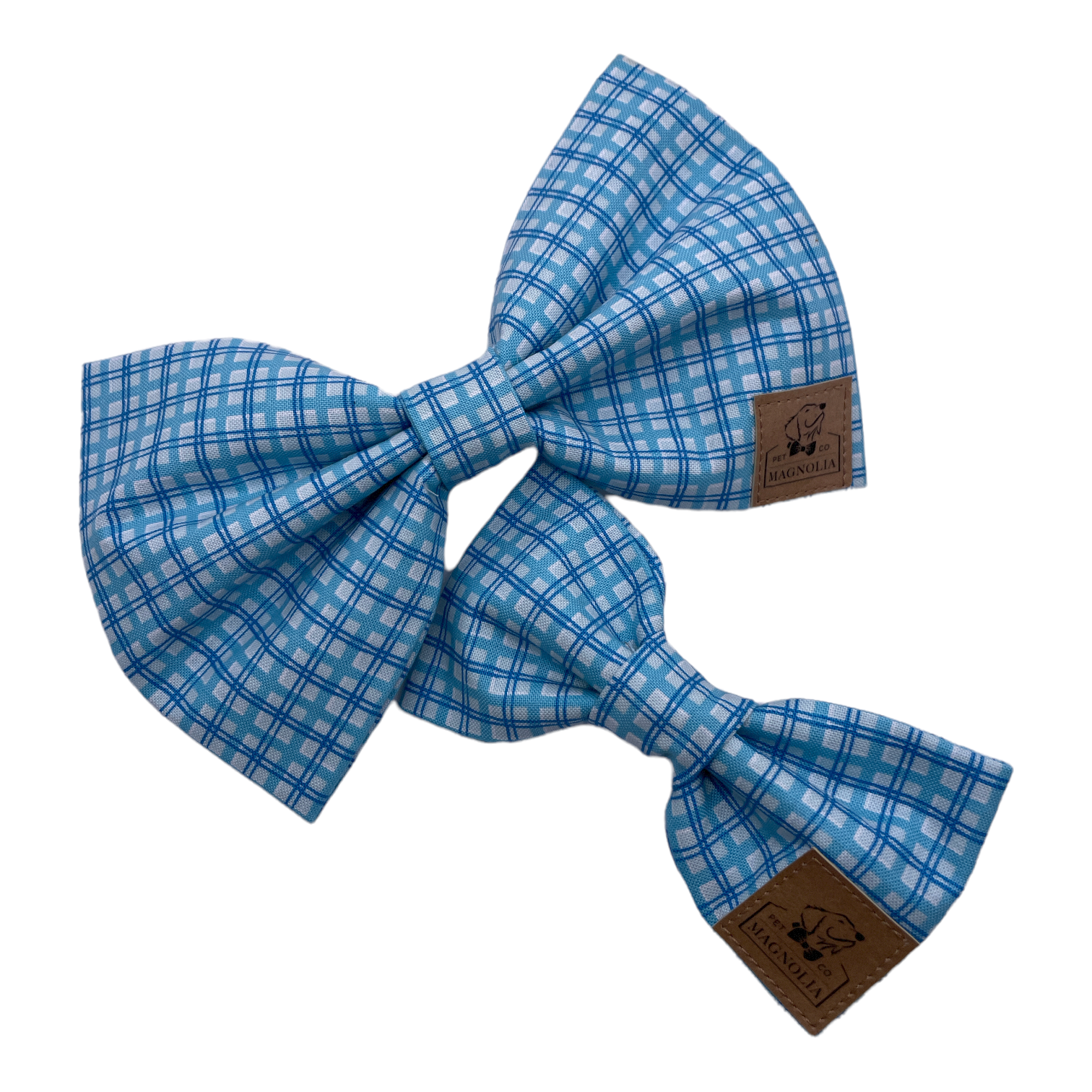 This Blue Plaid Dog Bow Tie features a fresh, crisp white background with a two-tone blue plaid design, perfect for adding a touch of sophistication to any springtime celebration or picnic outing.